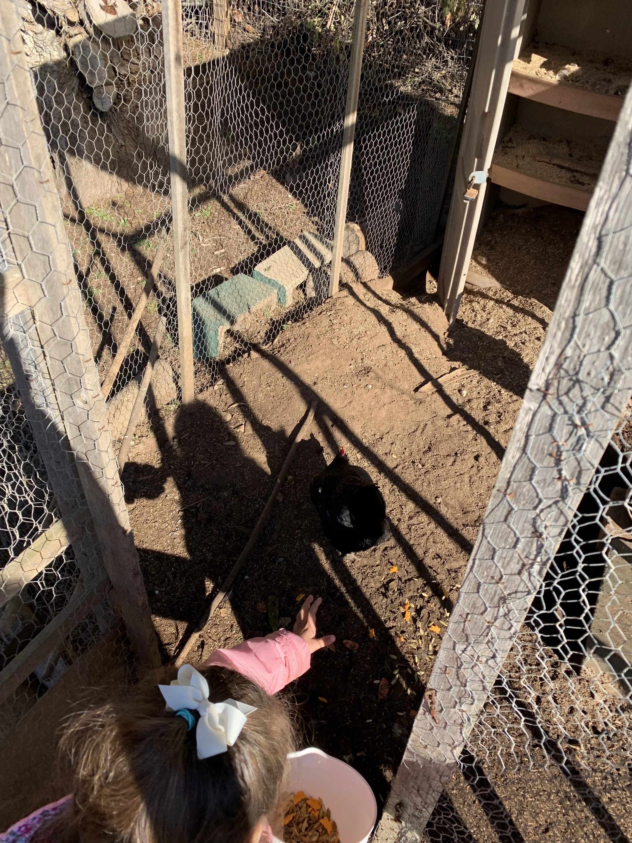 I love to spend a few minutes with them outside after class. This day I learned that that the daily chicken duty to feed them, and let them loose.
