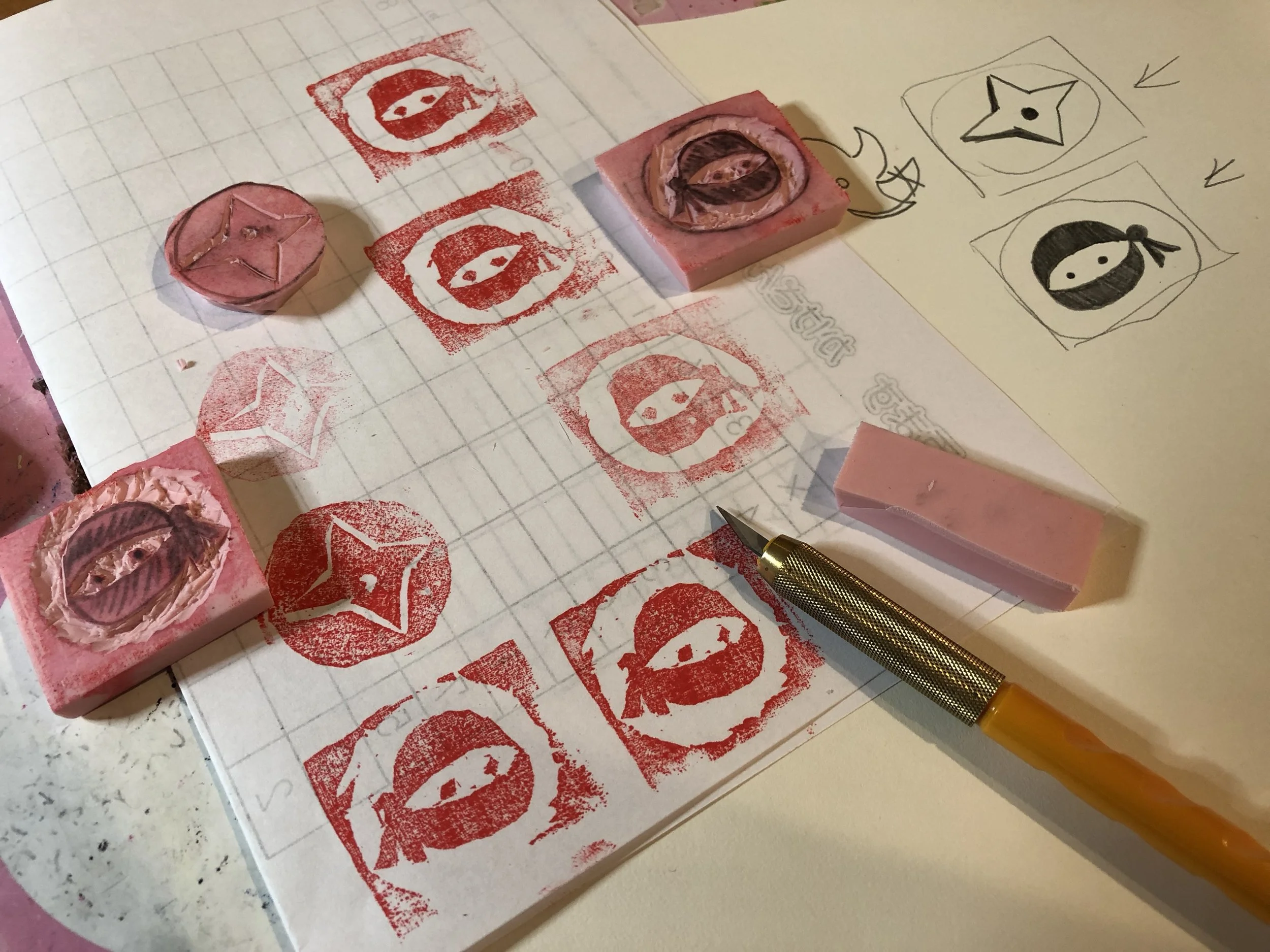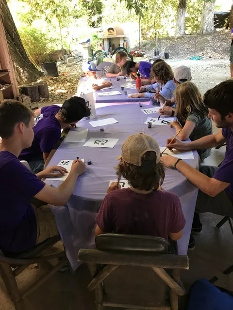 このキャンプは道場から20分程離れた山の中で行われます。忍者達は火を起こしたり、木を切って道具を作ったり、木を集めて小屋を作ったり、全身に泥を塗ってカモフラージュしたり、様々なサバイバルスキルを学びます。去年から私もグループで順番に回ってくるブースを担当することになりました。去年は折り紙、書共に1回20分を3ローテーション。今年は折り紙1日、書2日、各30分を3ローテーション。書が2回あるのが嬉しい。残りの時間はカメラマンとしてみんなをキャッチしながらの参加です。