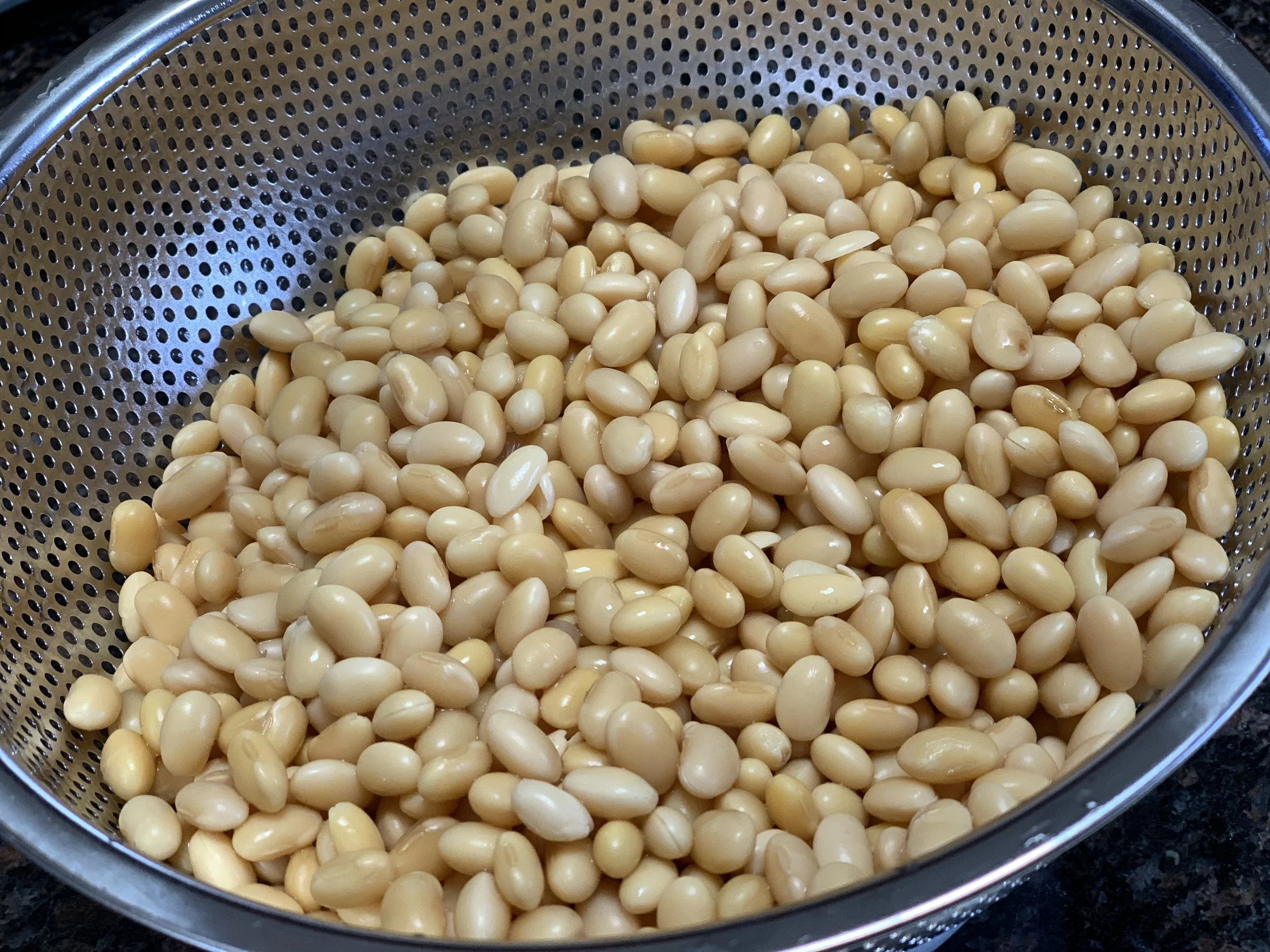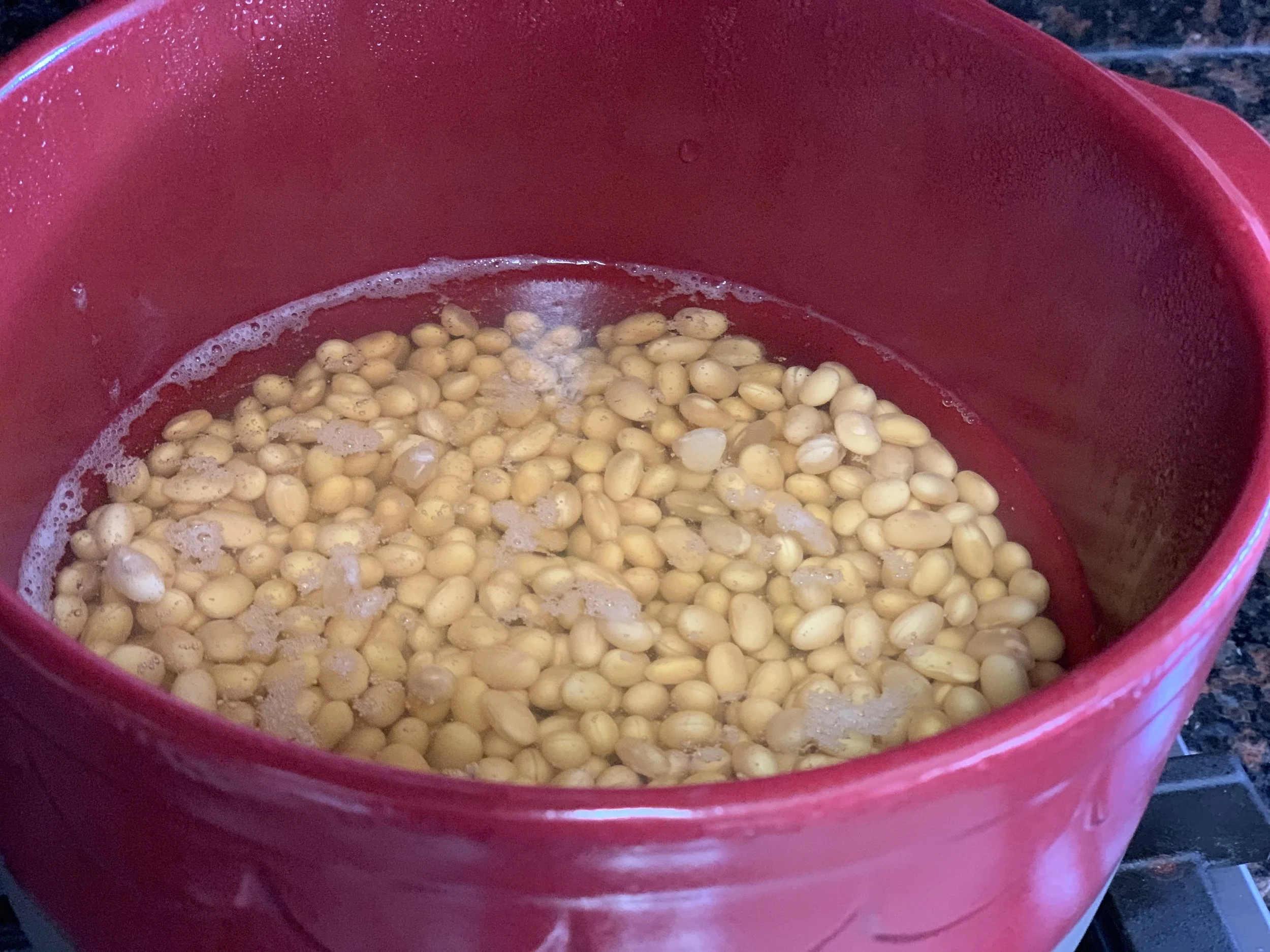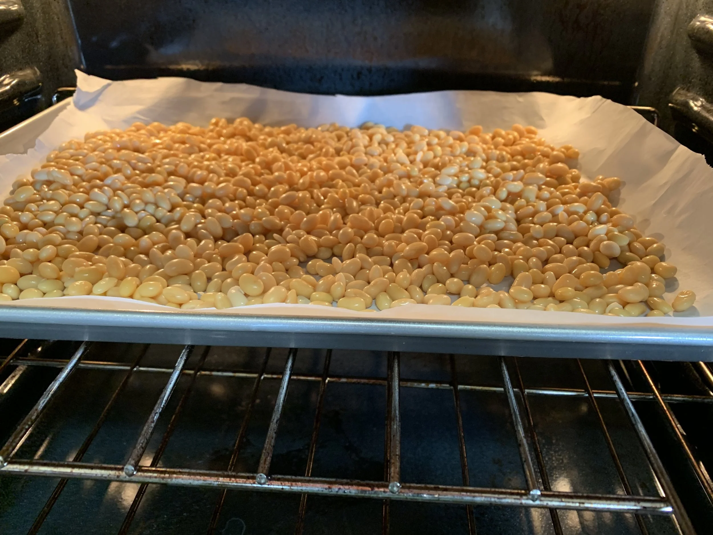 ということで、朝からあたふた。一晩水につけておく大豆は、3時間熱湯につけて戻し、水気を拭いてオーブンへ。香ばしい香りがするまでじっくり煎ります。